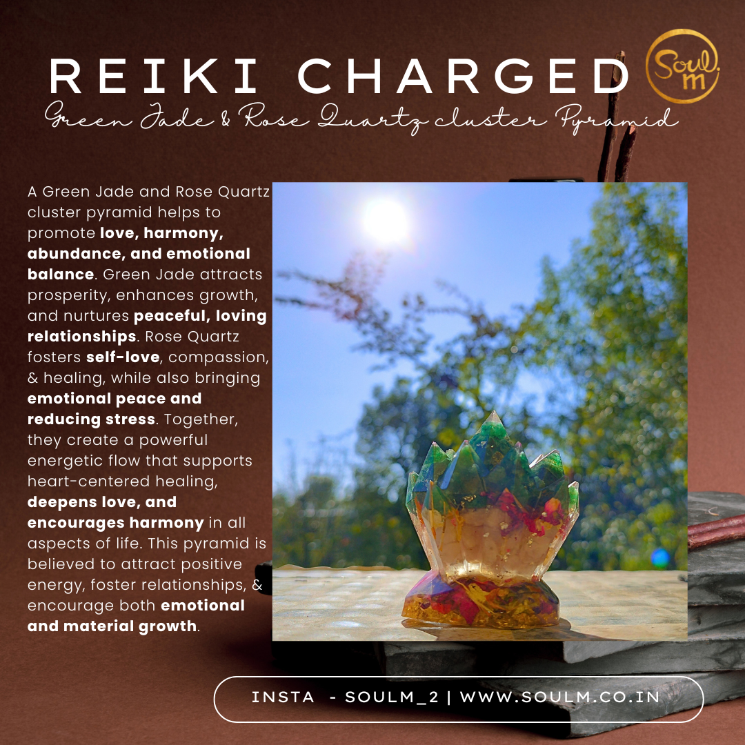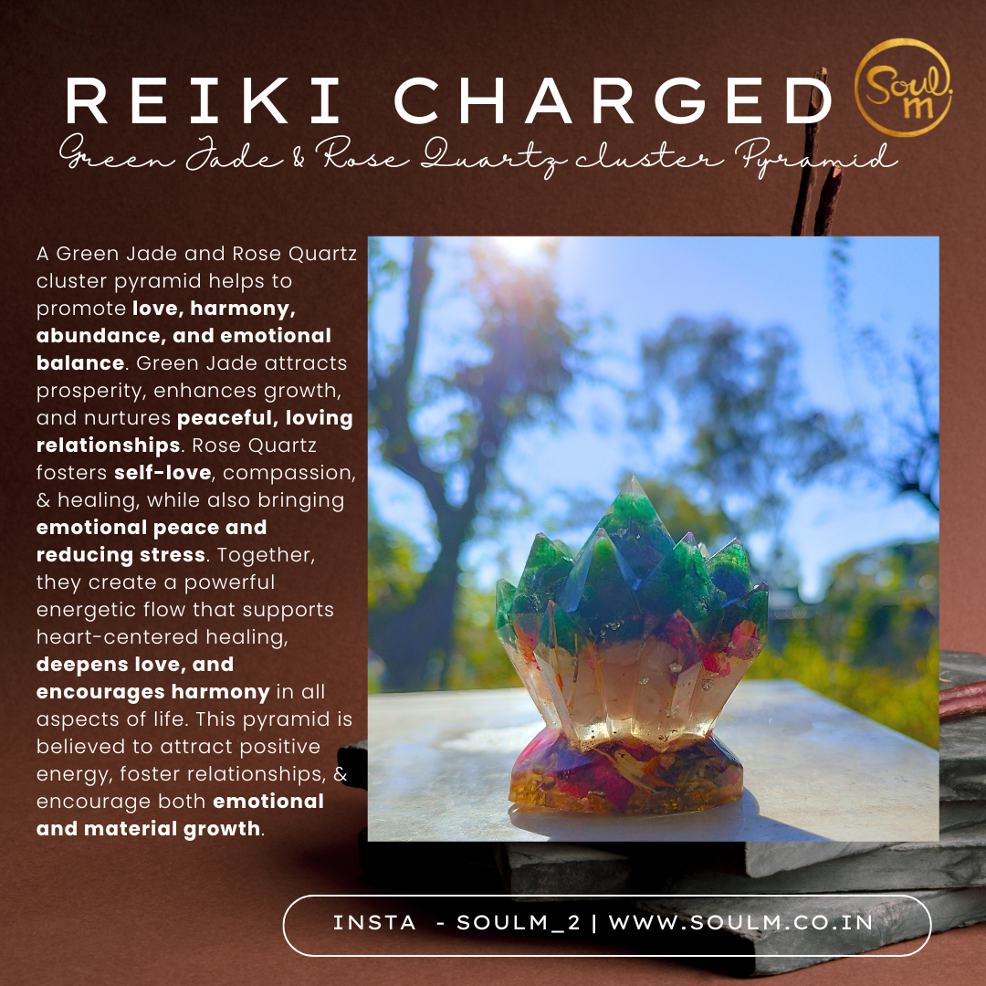 Reiki Charged Green Jade and Rose Quartz are both powerful crystals that are believed to have numerous metaphysical properties. When combined in a cluster pyramid form, they offer a blend of their individual benefits. Here are ten benefits of a Green Jade and Rose Quartz Cluster Pyramid: