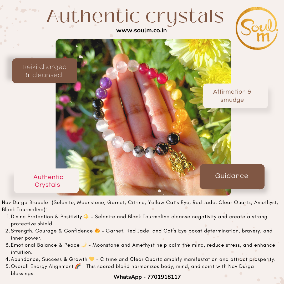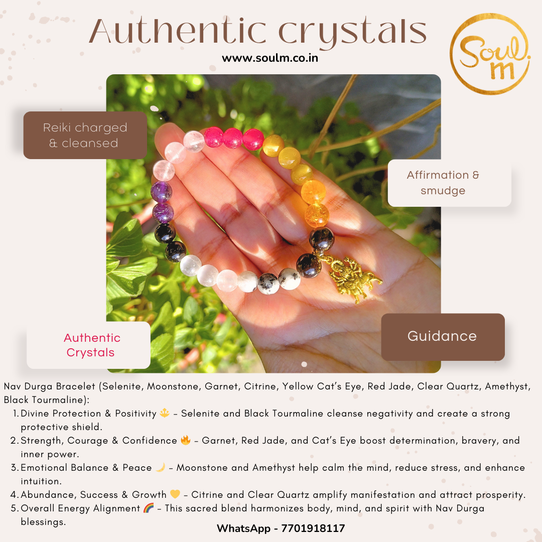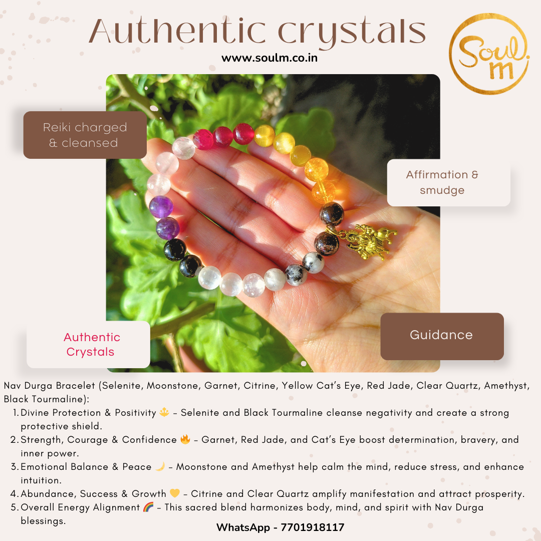 Nav Durga Bracelet (Selenite, Moonstone, Garnet, Citrine, Yellow Cat’s Eye, Red Jade, Clear Quartz, Amethyst, Black Tourmaline):