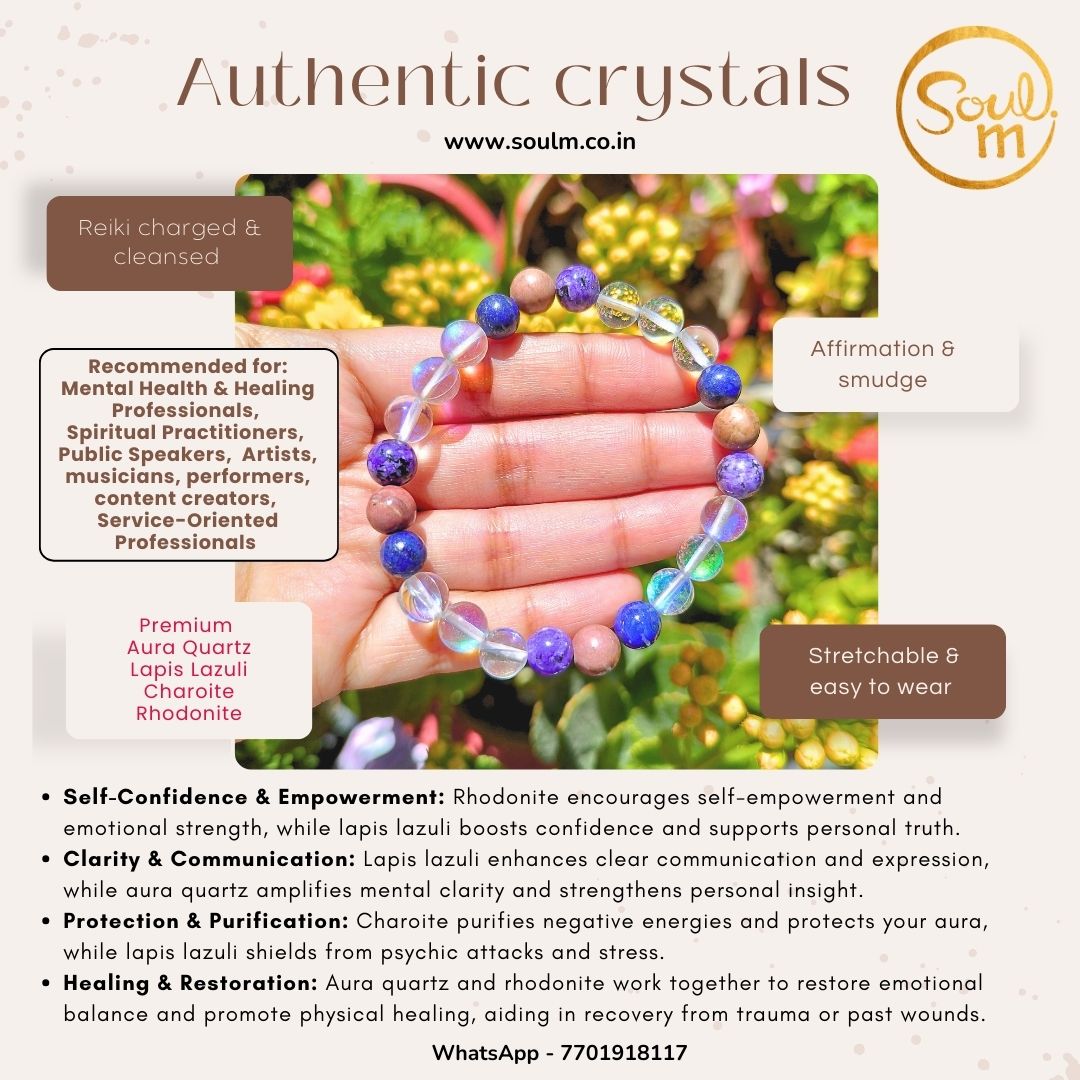 Wearing a bracelet with Premium Aura Quartz, Lapis Lazuli, Charoite, and Rhodonite creates a high-vibrational, transformative combination that supports spiritual awakening, emotional healing, and empowered self-expression. This is a deeply supportive blend for those undergoing inner growth or looking to live more authentically and soulfully.