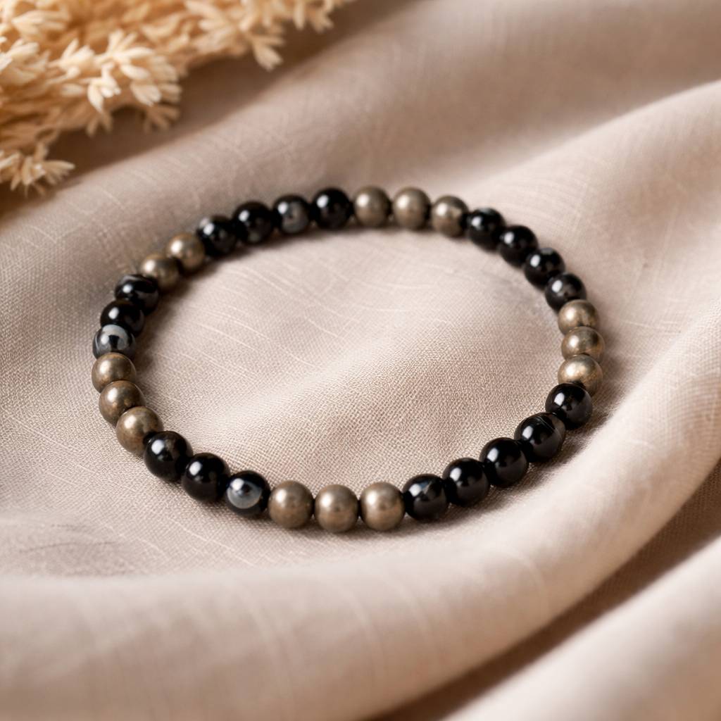 Reiki Charged Natural Pyrite and Sulemani Hakik, Round Beads Crystal Bracelet For Men, Women, Boys, Girls (Metallic & Black)