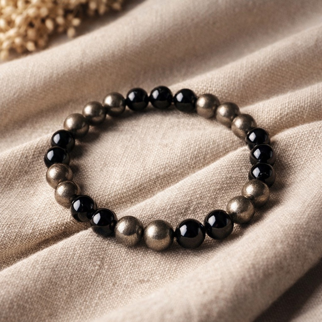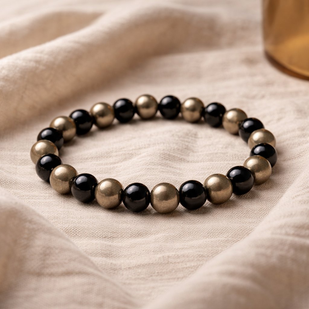 Reiki Charged Natural Pyrite and Sulemani Hakik, Round Beads Crystal Bracelet For Men, Women, Boys, Girls (Metallic & Black)
